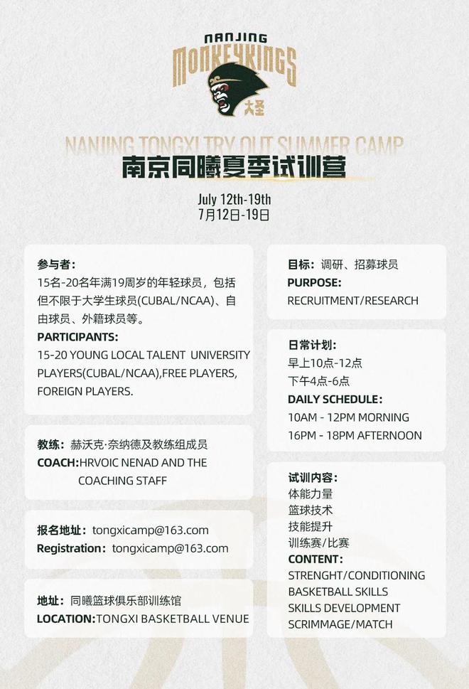 同曦男籃夏季試訓(xùn)營7月12日開營,計劃招募至少15名年輕球員