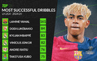 本賽季西甲成功過(guò)人榜:亞馬爾161次斷層領(lǐng)先,比第2名多77次