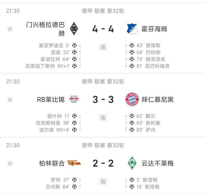 遞增數(shù)列!今晚三場(chǎng)德甲比分依次為2-2、3-3、4-4
