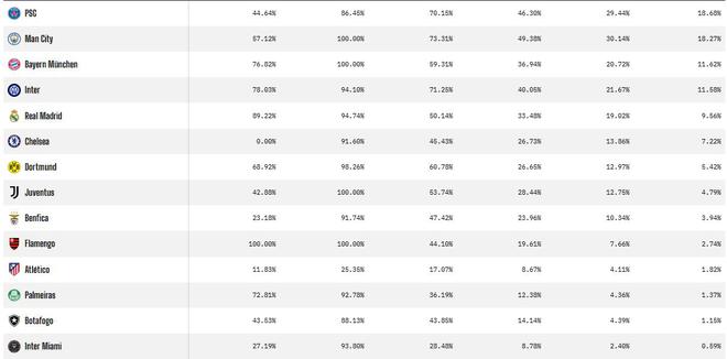 外媒更新世俱杯奪冠概率:巴黎依舊第一,馬競跌至1.82%