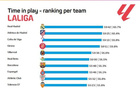 本賽季西甲平均凈比賽時(shí)間排行:皇馬居首,赫塔費(fèi)墊底