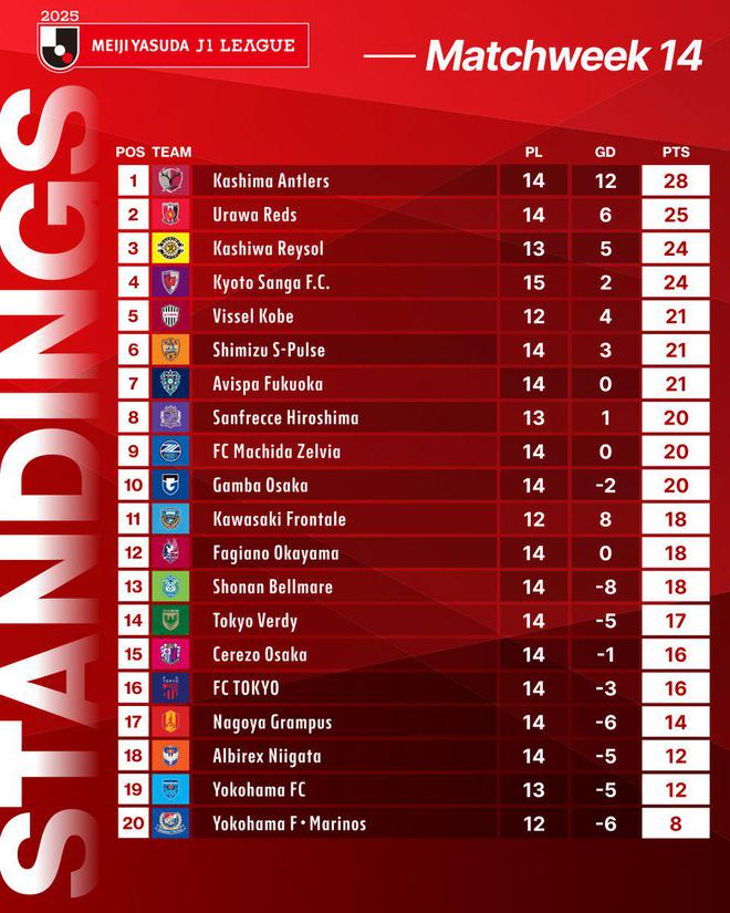 日職聯(lián)積分榜:鹿島鹿角3分領(lǐng)跑,橫濱水手12場1勝墊底