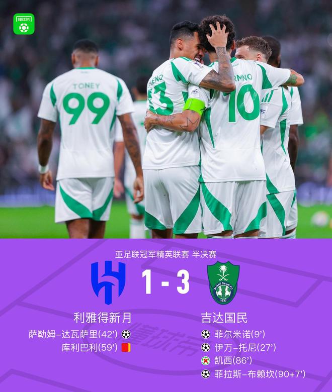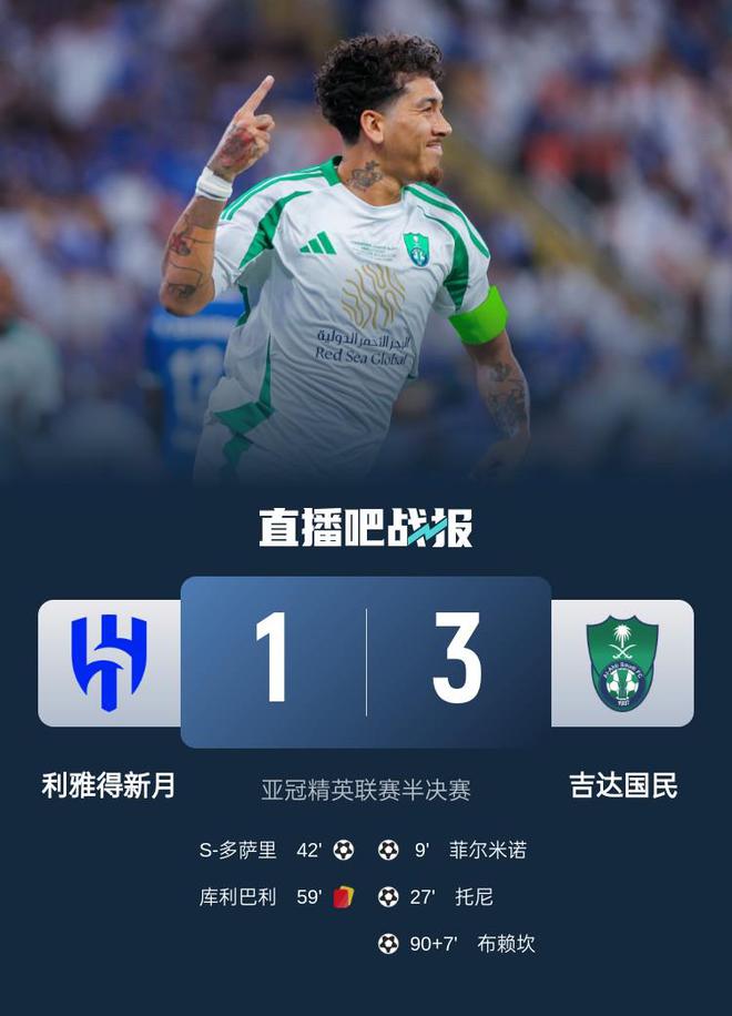 吉達(dá)國民3-1十人利雅得新月晉級亞冠精英決賽,菲爾米諾建功,凱西失點
