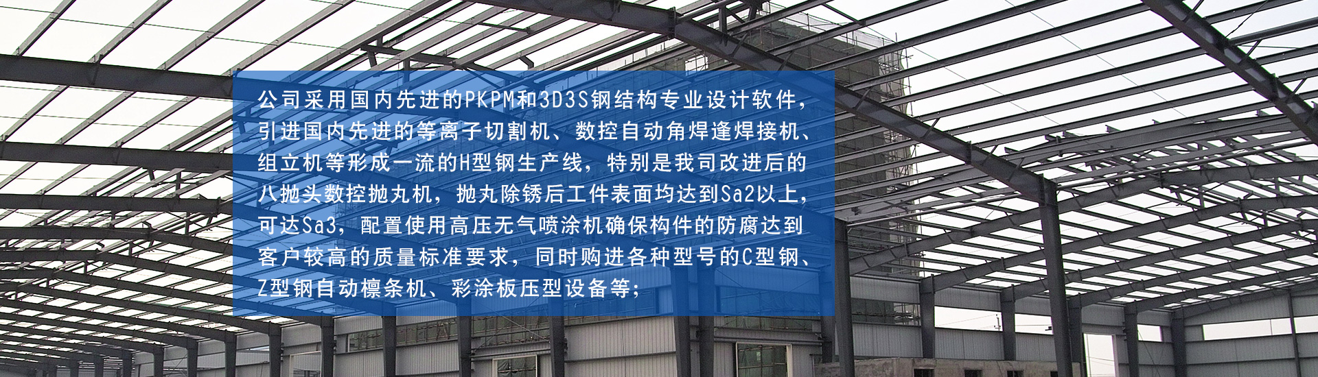 鋼結(jié)構(gòu)建筑憑具有造型新穎、結(jié)構(gòu)靈活、施工周期短、造價(jià)低、適應(yīng)性強(qiáng)、拆遷殘值高、環(huán)保安全等特點(diǎn),廣泛應(yīng)用于工業(yè)廠(chǎng)房、倉(cāng)儲(chǔ)、展廳、場(chǎng)館、冷庫(kù)和住宅、高層建筑、別墅等民用建筑。公司采用國(guó)內(nèi)先進(jìn)的PKPM和3D3S鋼結(jié)構(gòu)專(zhuān)業(yè)設(shè)計(jì)軟件,引進(jìn)國(guó)內(nèi)先進(jìn)的等離子切割機(jī)、數(shù)控自動(dòng)角焊逢焊接機(jī)、組立機(jī)等形成一流的H型鋼生產(chǎn)線(xiàn),特別是我司改進(jìn)后的八拋頭數(shù)控拋丸機(jī),拋丸除銹后工件表面均達(dá)到Sa2以上,可達(dá)Sa3,配置使用高壓無(wú)氣噴涂機(jī)確保構(gòu)件的防腐達(dá)到客戶(hù)較高的質(zhì)量標(biāo)準(zhǔn)要求,同時(shí)購(gòu)進(jìn)各種型號(hào)的C型鋼、Z型鋼自動(dòng)檁條機(jī)、彩涂板壓型設(shè)備等;并引進(jìn)大批人才,秉承“以質(zhì)量求生存、以科技求發(fā)展、以信譽(yù)求市場(chǎng)、以管理求效益”的經(jīng)營(yíng)管理理念,形成了以工程承包為龍頭,工程設(shè)計(jì)、生產(chǎn)制造、建材配套、吊裝運(yùn)輸、建筑安裝等一條龍服務(wù)的鋼結(jié)構(gòu)生產(chǎn)經(jīng)營(yíng)實(shí)體......